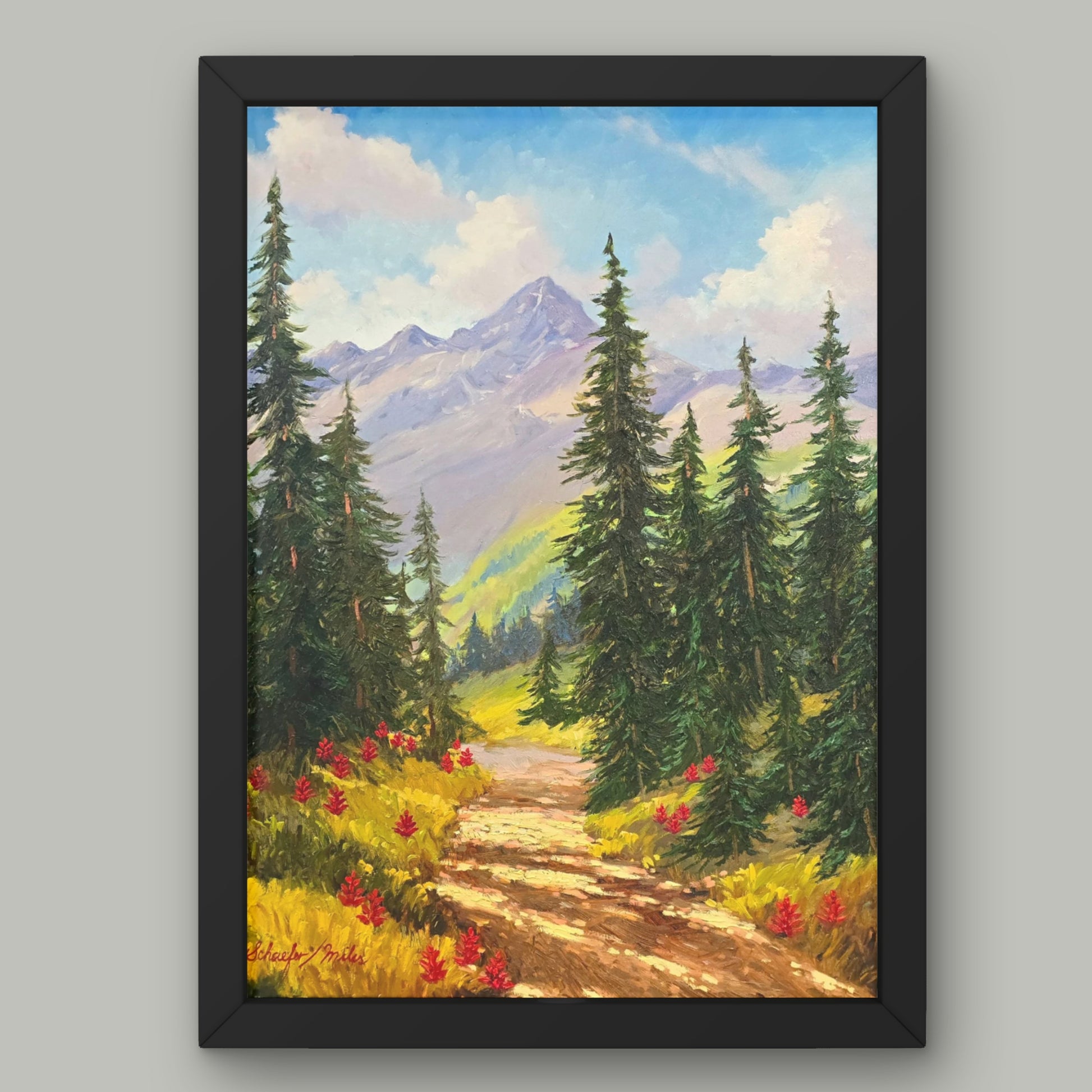 "Mountain Top Glory" Original oil painting, reminds us that every trail through the woods is a passage into resilience and beauty, that even in stillness there is movement, and that the terrain we traverse shapes something enduring inside us. I hope this painting opens a window for you to experience that journey—and to bring a touch of mountain magnificence into your own daily horizon. Framed 1 3/4 Black Float Frame. Inquire about custom framing.