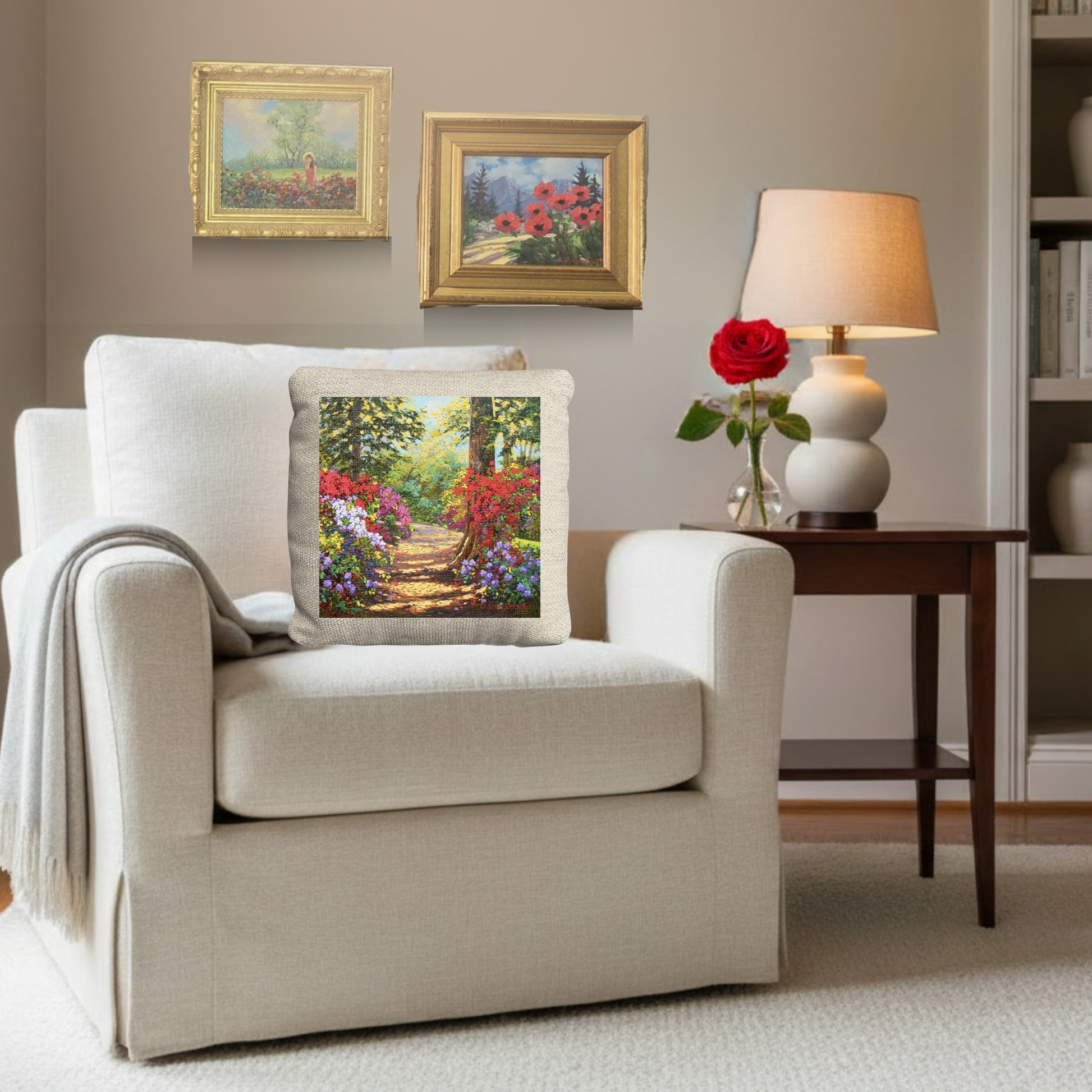 Bring the garden indoors with the "Lovers Lane" Art Pillow. 🎨✨ Body: Why leave our "Lovers Lane" landscape on the wall? This decorative pillow transforms our original oil painting into a plush, restorative accent for your favorite reading nook or sofa.